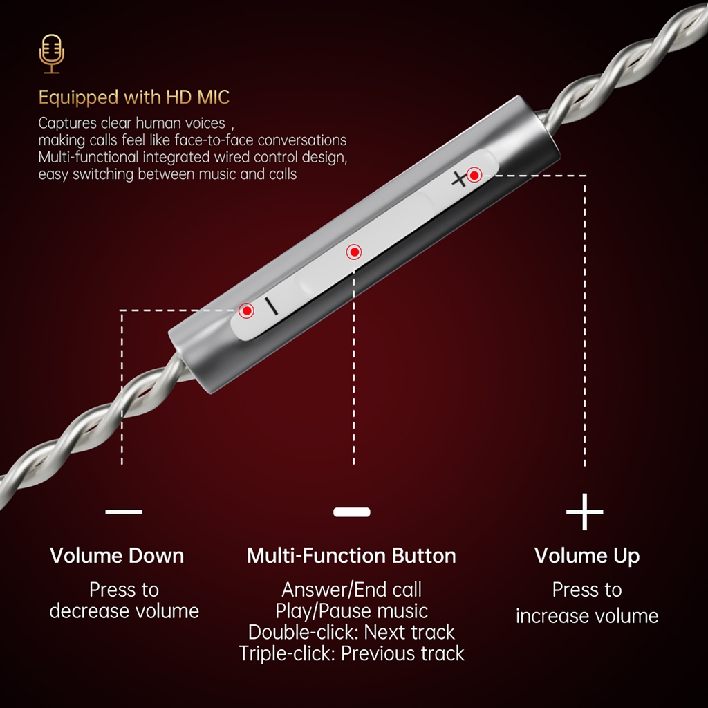 Dây kết nối: bện mạ bạc, có mic, kết nối 2pin thông dụng