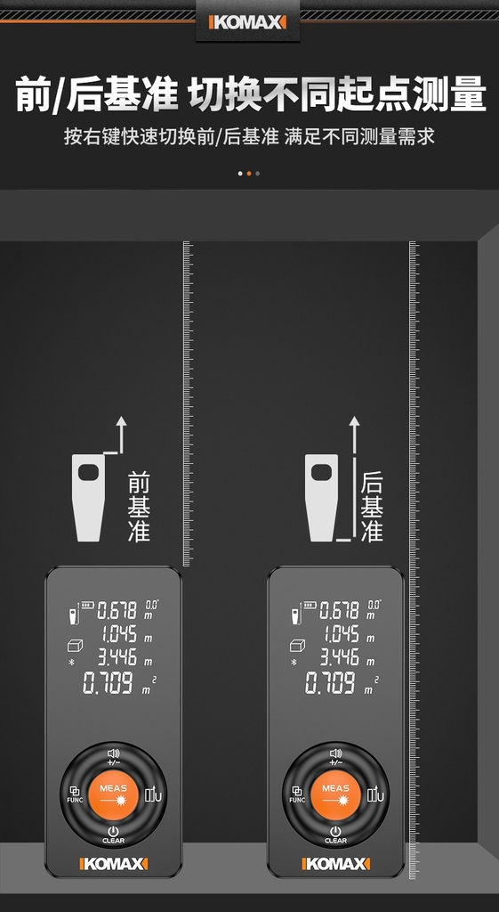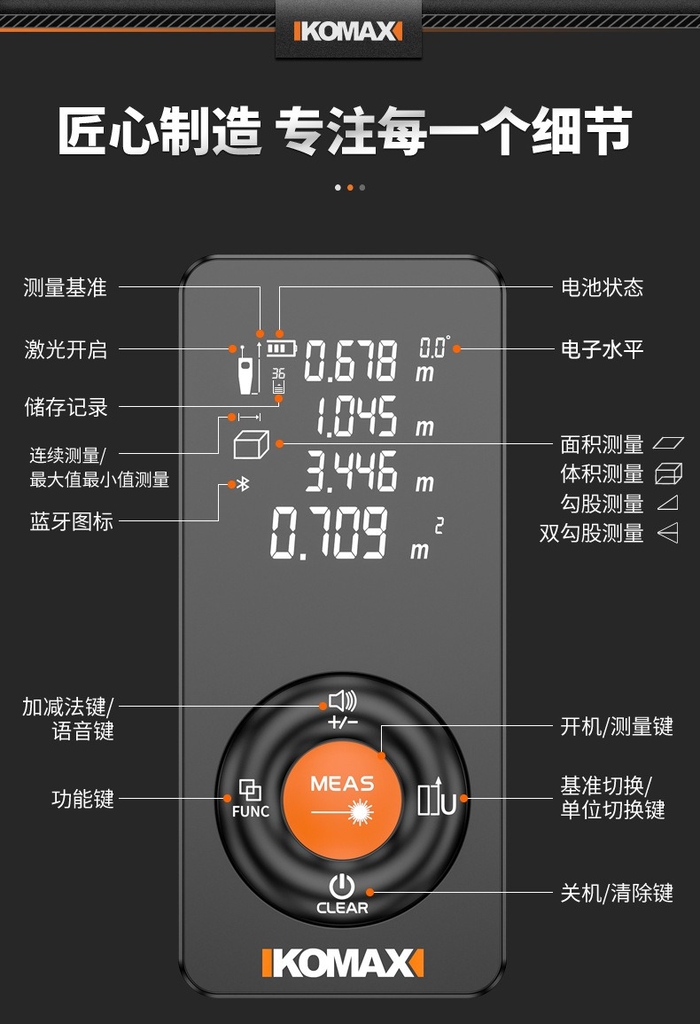 Tính năng: Đo liên tục, Đo gián tiếp pytago, chính gốc đo, Tính diện tích, Tính thể tích.
